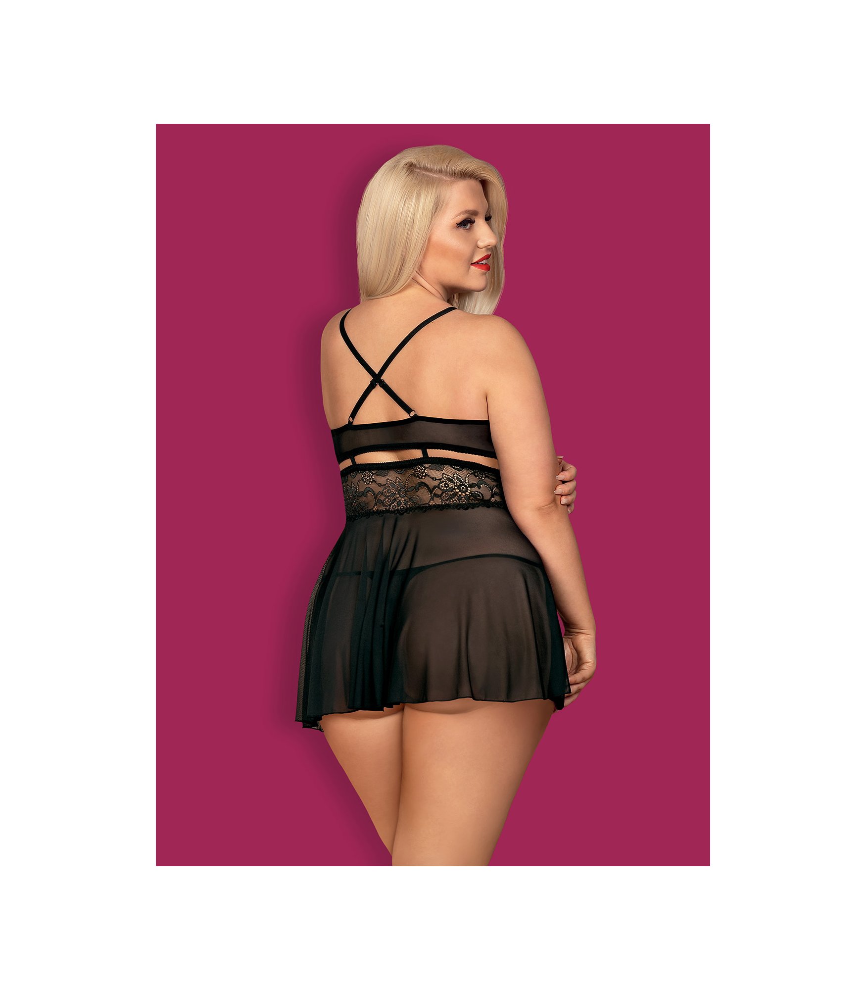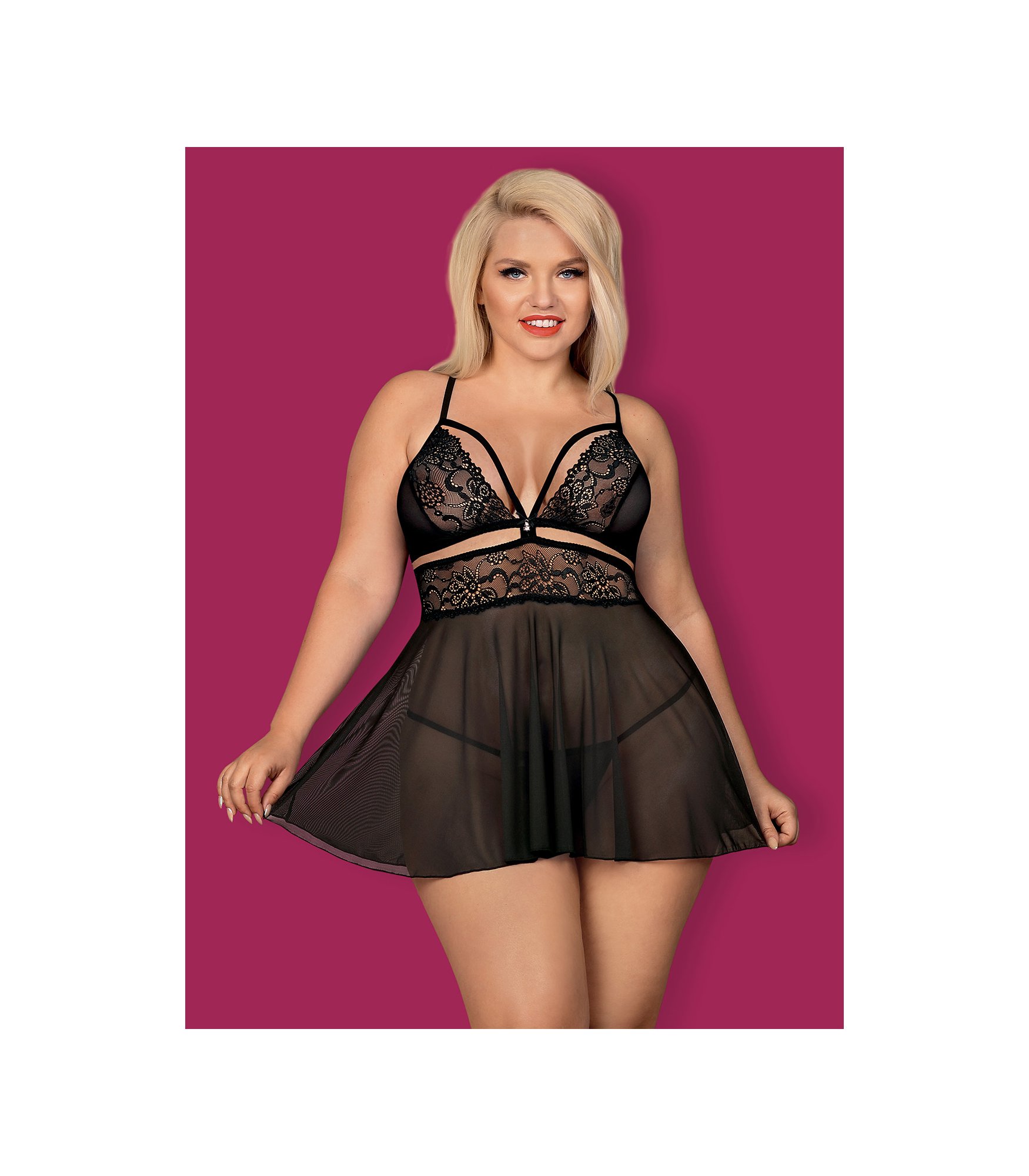 Babydoll, modell 838, i svart färg från Obsessive finns i olika storlekar. En väldigt vacker, inte så avslöjande babydoll. Elastisk upptill med spets runt kuporna och band som håller den uppe. Nedanför kuporna hittar man även ett litet , nickelfritt smycke, enkelt, men elegant.