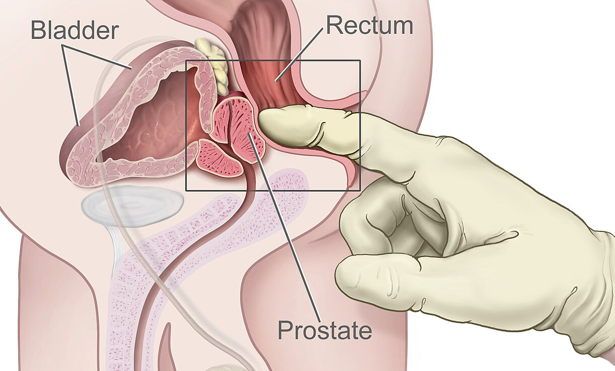 Prostatan kan nås via ändtarmen och sitter ungefär 3–7 cm in, riktad framåt mot magen. Den är ungefär lika stor som en kastanj och känns ofta som en mjuk, något fast struktur.