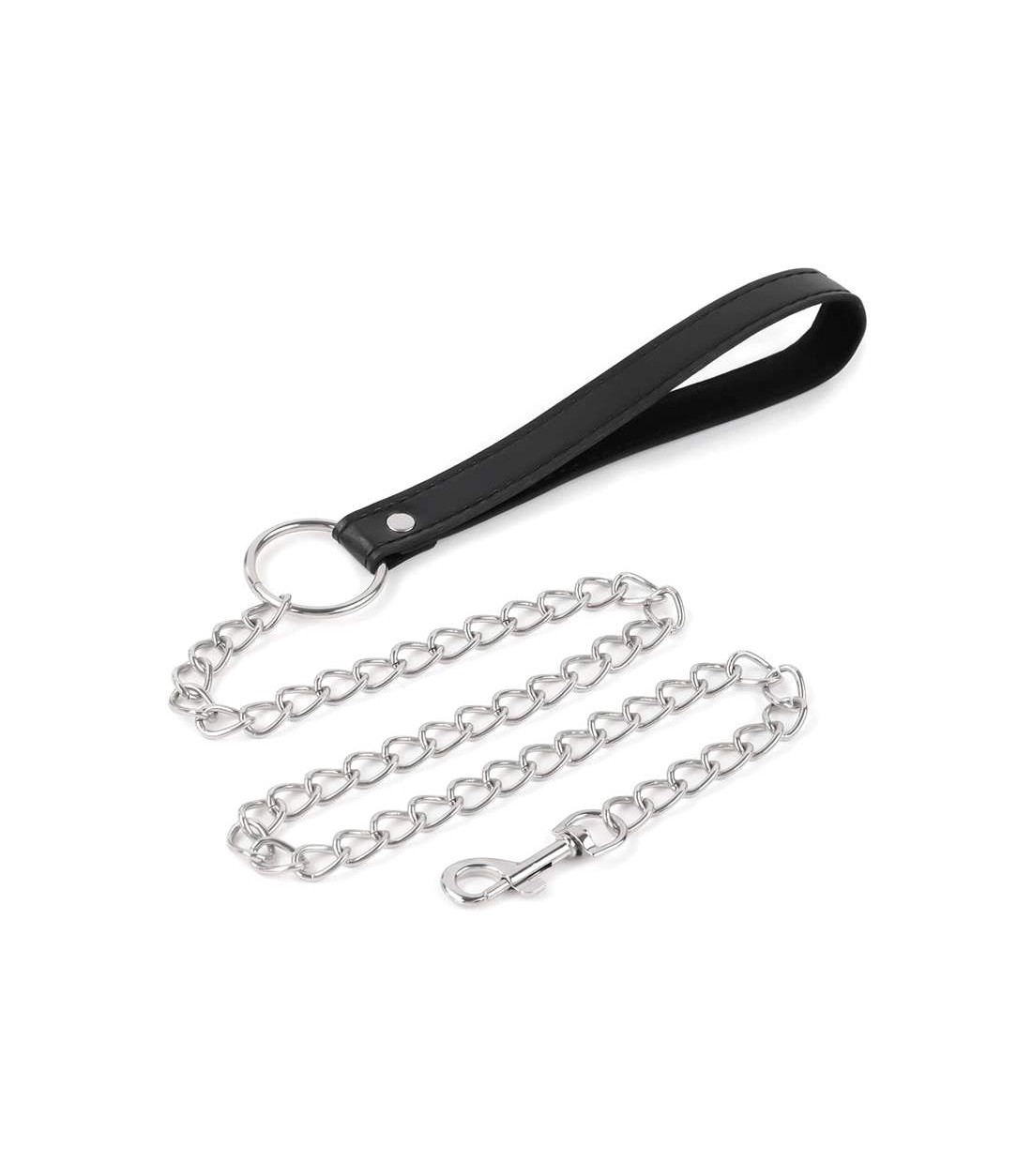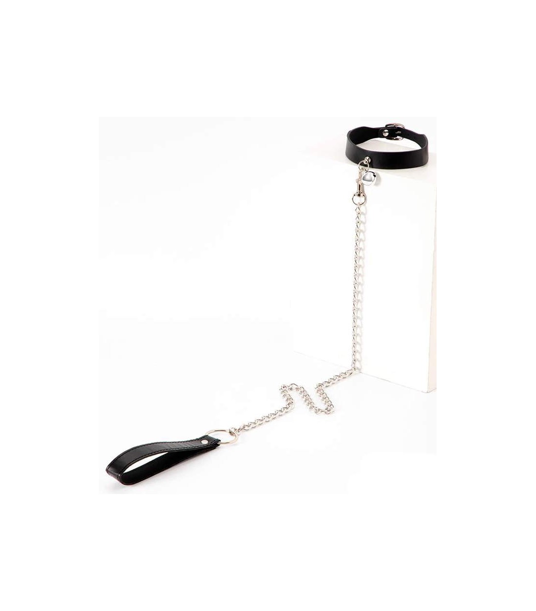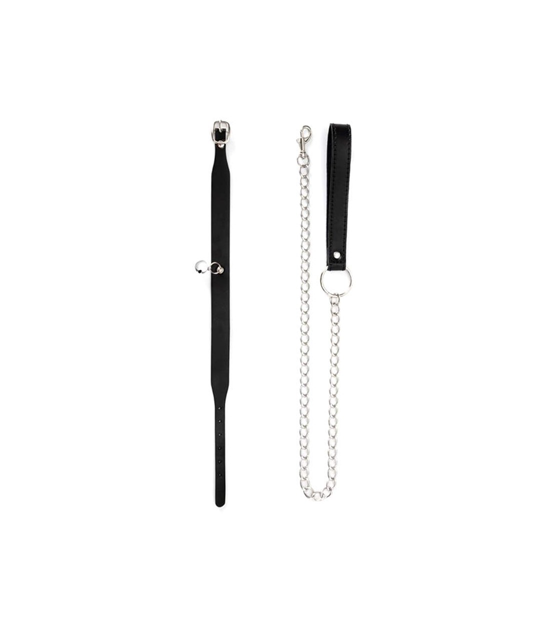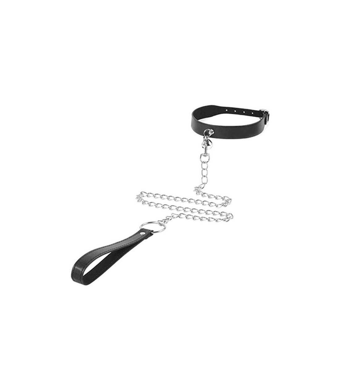 Enkelt, stilfullt, minimalistiskt halsband för total kontroll! Allt i svart, mjukare konstläder med lång kedja och koppel. Halsbandet har dessutom en liten bjällra.