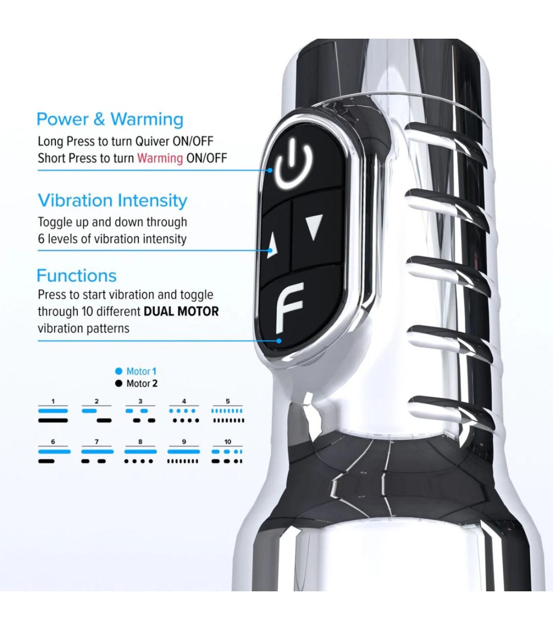 Quiver har två motorer för de olika funktioner. Du kan enkelt anpassa din njutning med ett knapptryck tack vare de 10 olika vibrationslägena som vardera har 6 intensitetsnivåer. Det finns ett läge för varje humör och önskemål, oavsett om du söker något mjukt eller intensivt. Dessutom har masturbatorn en inbyggd uppvärmningsfunktion som snabbt når rätt kroppstemperatur för en maximalt verklighetstrogen känsla direkt från start.