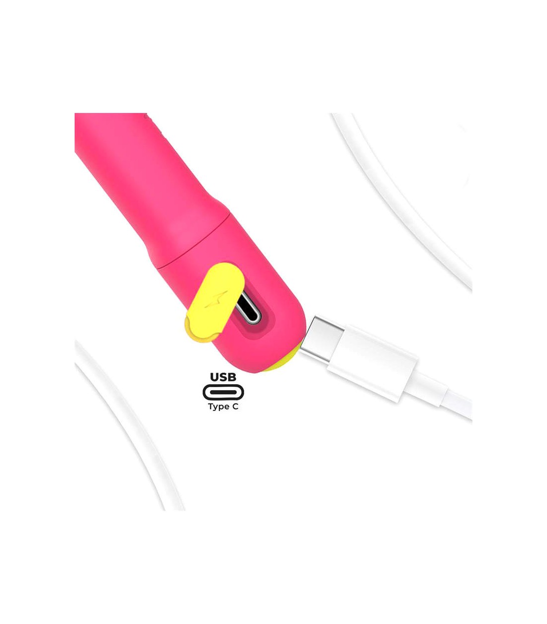 Den har hela 10 olika vibationsprogram och allt styrs enkelt med en enda knapp i botten. Laddningen är enkelt med vanlig USB-C sladd. Ladding på närmare 1 timme, ger upp till 1 timmes lektid.