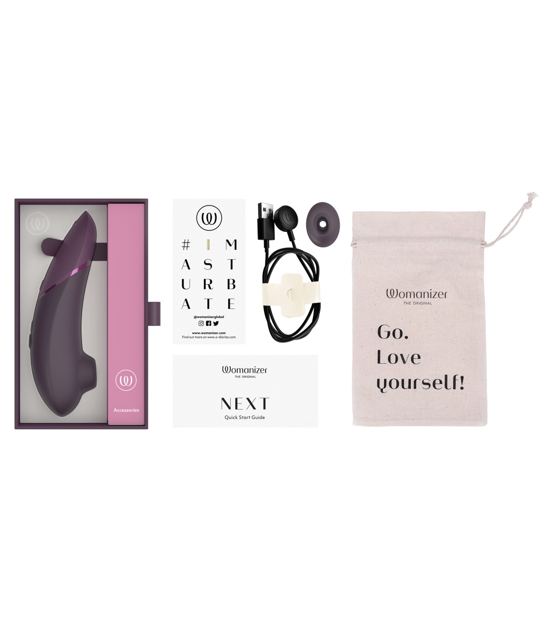 I paketet får man med manual, förvaringspåse, USB-sladd för laddning, Womanizer Next, samt två munstycken (i olika storlekar, en av dessa sitter redan på).