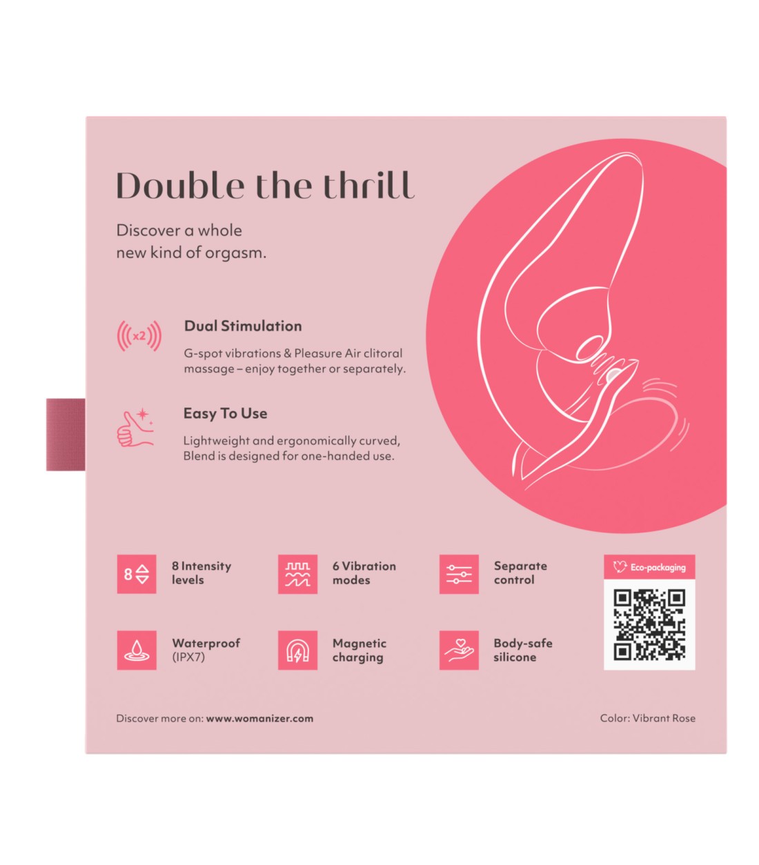 Blend är en enkel, rund, klitorisstimulator med tryckluft och samtidigt vibrator för g-punkten från Womanizer. Härlig leksak för starka och sköna orgasmer, genom skön stimulering i två punkter samtidigt. Enkel styrning, enkla och skäna funktioner. Fysisk beröring stimulerar din klitoris och g-punkten får stimulering fråninsidan, men enkla och skäna funktioner i ett runt paket.