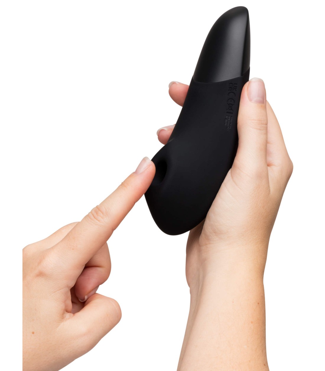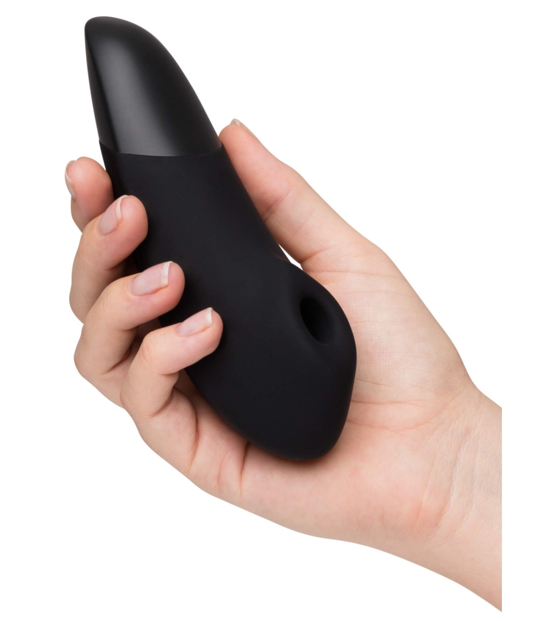 Leksaken är tillverkad ytterst i svart silikon av bra kvalité och snygg nederdel i svart plast, som skiljer färgerna åt en aning. Den har en bra ergonomisk design, ligger bra och stabilt i handen, samt med ditt pekfinger på +/ -knapparna. Själva munstycket är ganska hårt och som första Womanizer, så är munstycket inte avtagbart, utan är ett med hela stimulatorn.