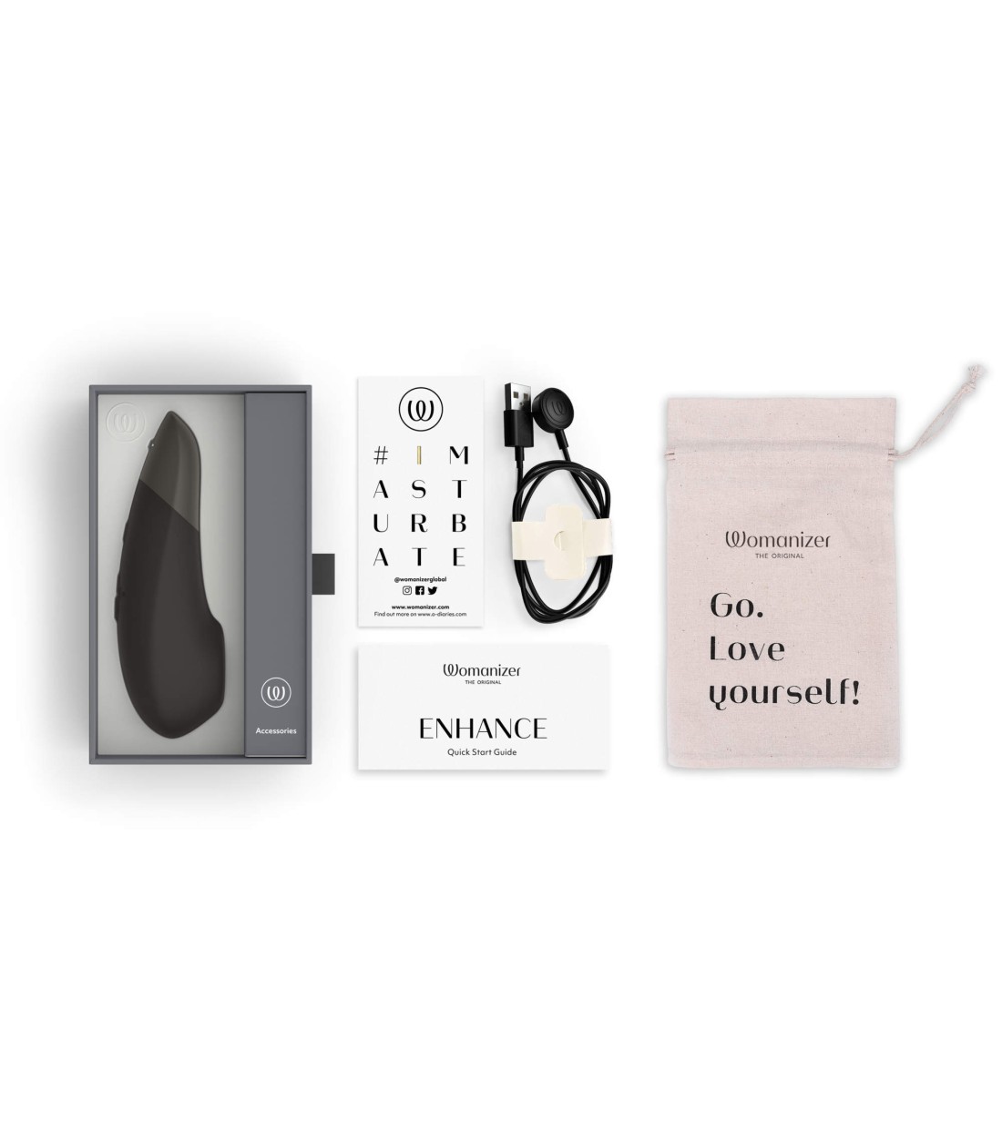 I paketet får man med manual, förvaringspåse, USB-sladd för laddning och själva Womanizer Enhance
