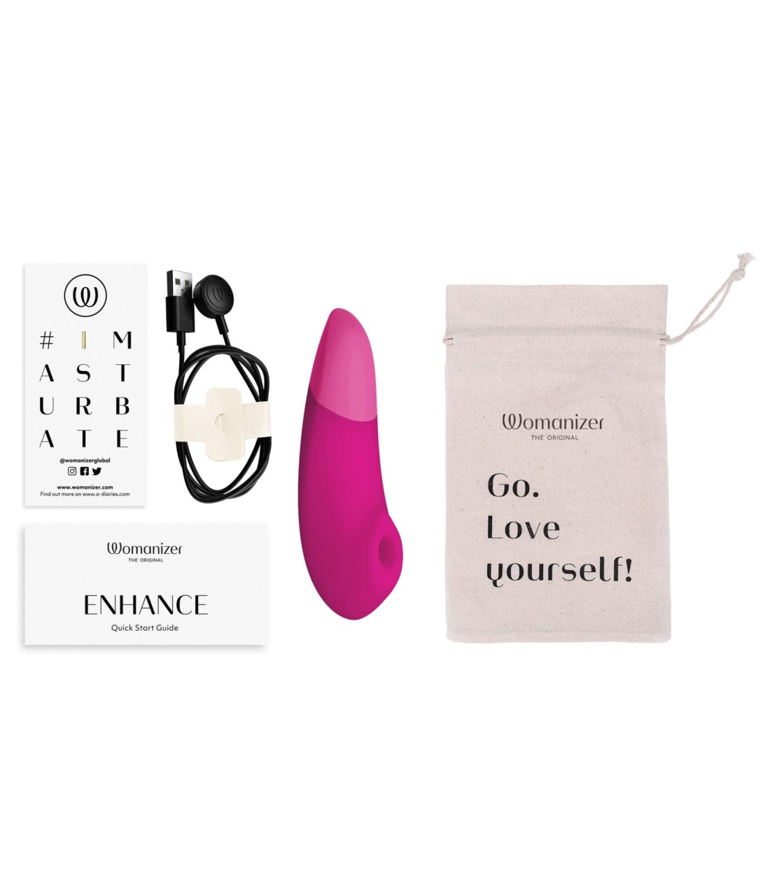 I paketet får man med manual, förvaringspåse, USB-sladd för laddning och själva Womanizer Enhance!