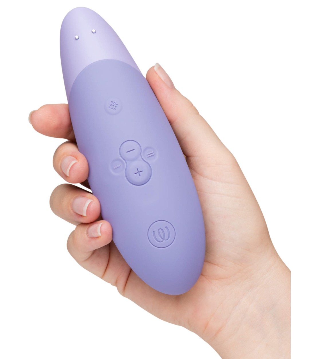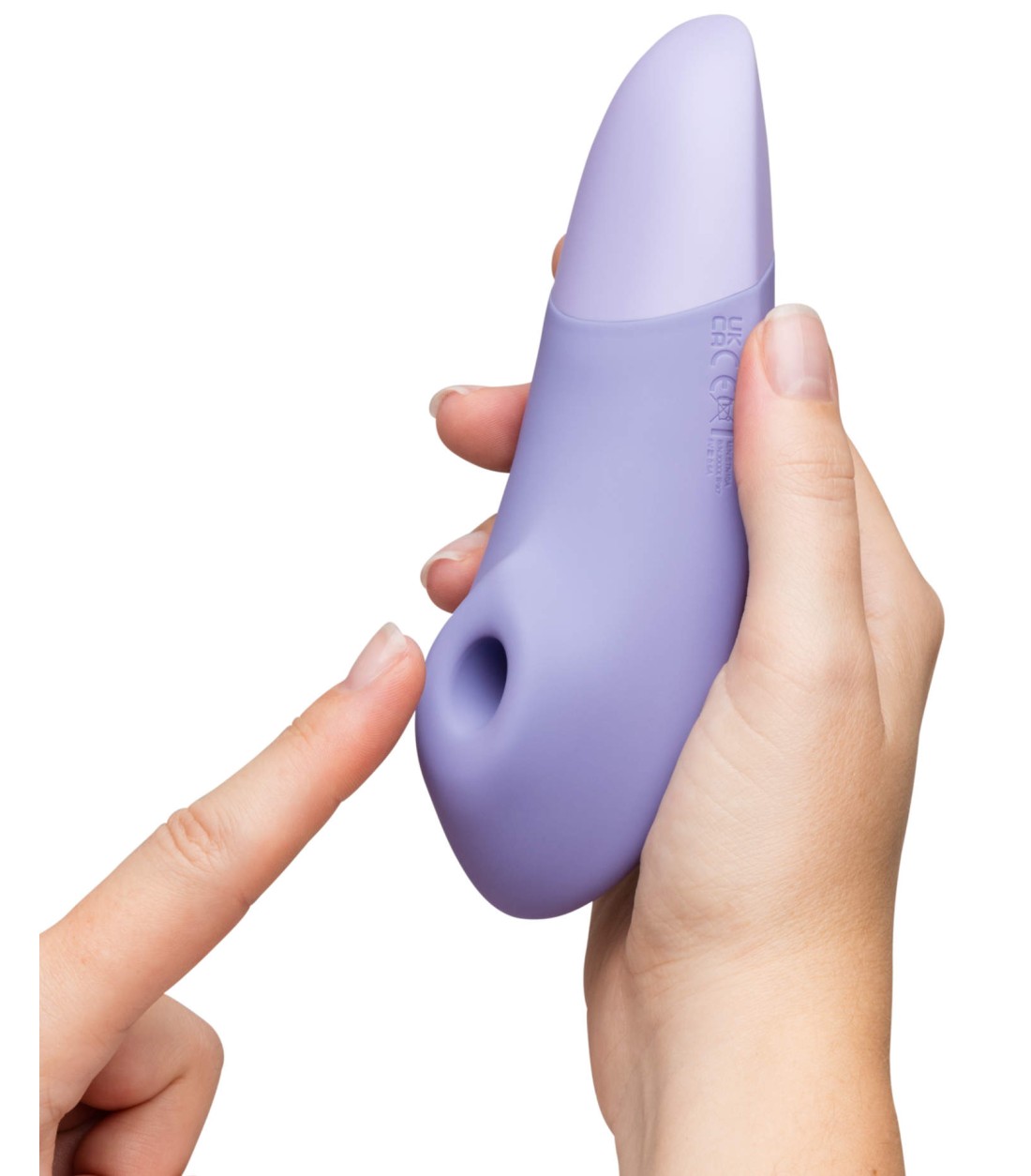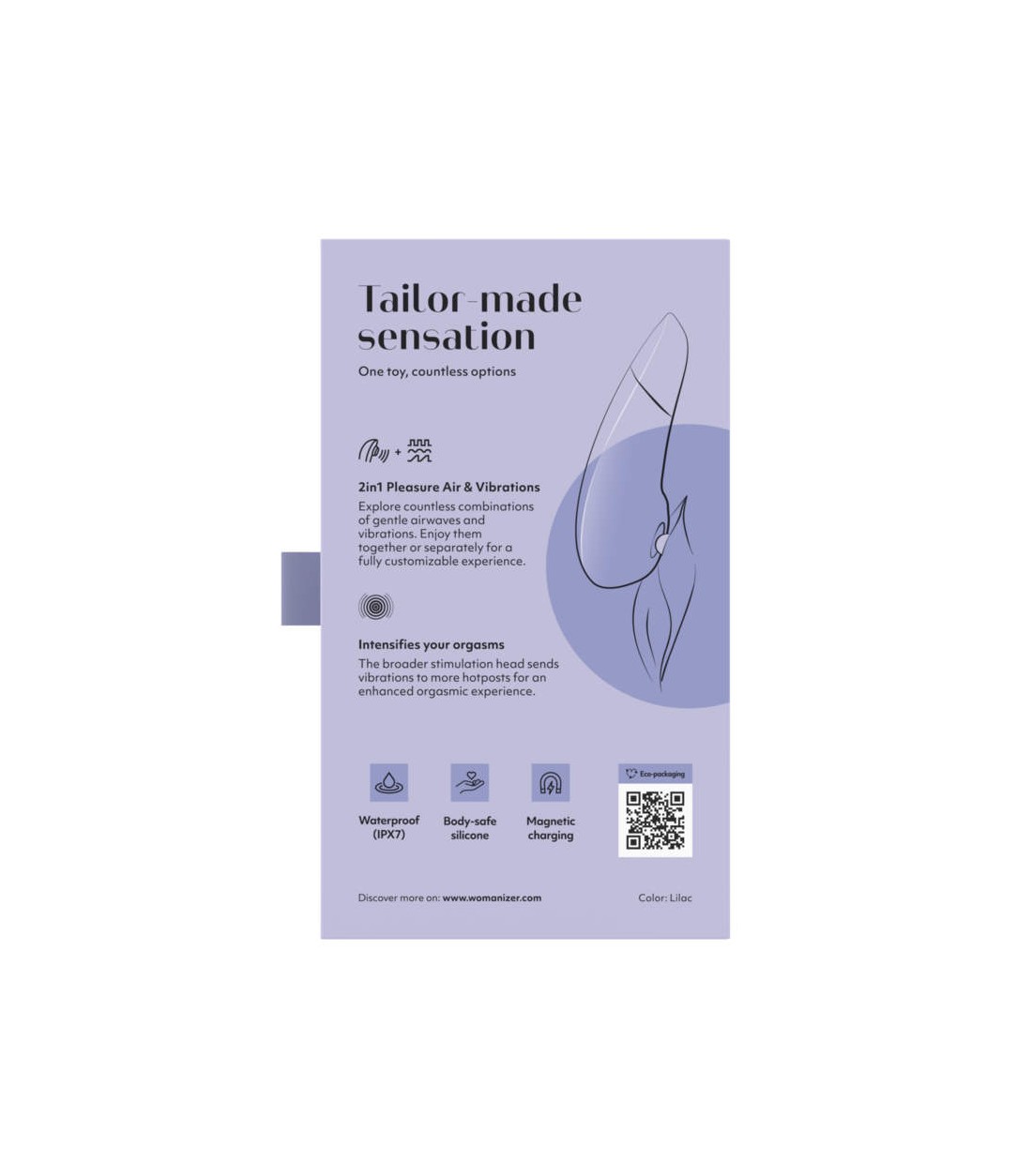 Leksaken är tillverkad ytterst i ljuslila silikon av bra kvalité och snygg nederdel i ljuslila plast, som skiljer färgerna åt en aning. Den har en bra ergonomisk design, ligger bra och stabilt i handen, samt med ditt pekfinger på +/ -knapparna. Själva munstycket är ganska hårt och som första Womanizer, så är munstycket inte avtagbart, utan är ett med hela stimulatorn.