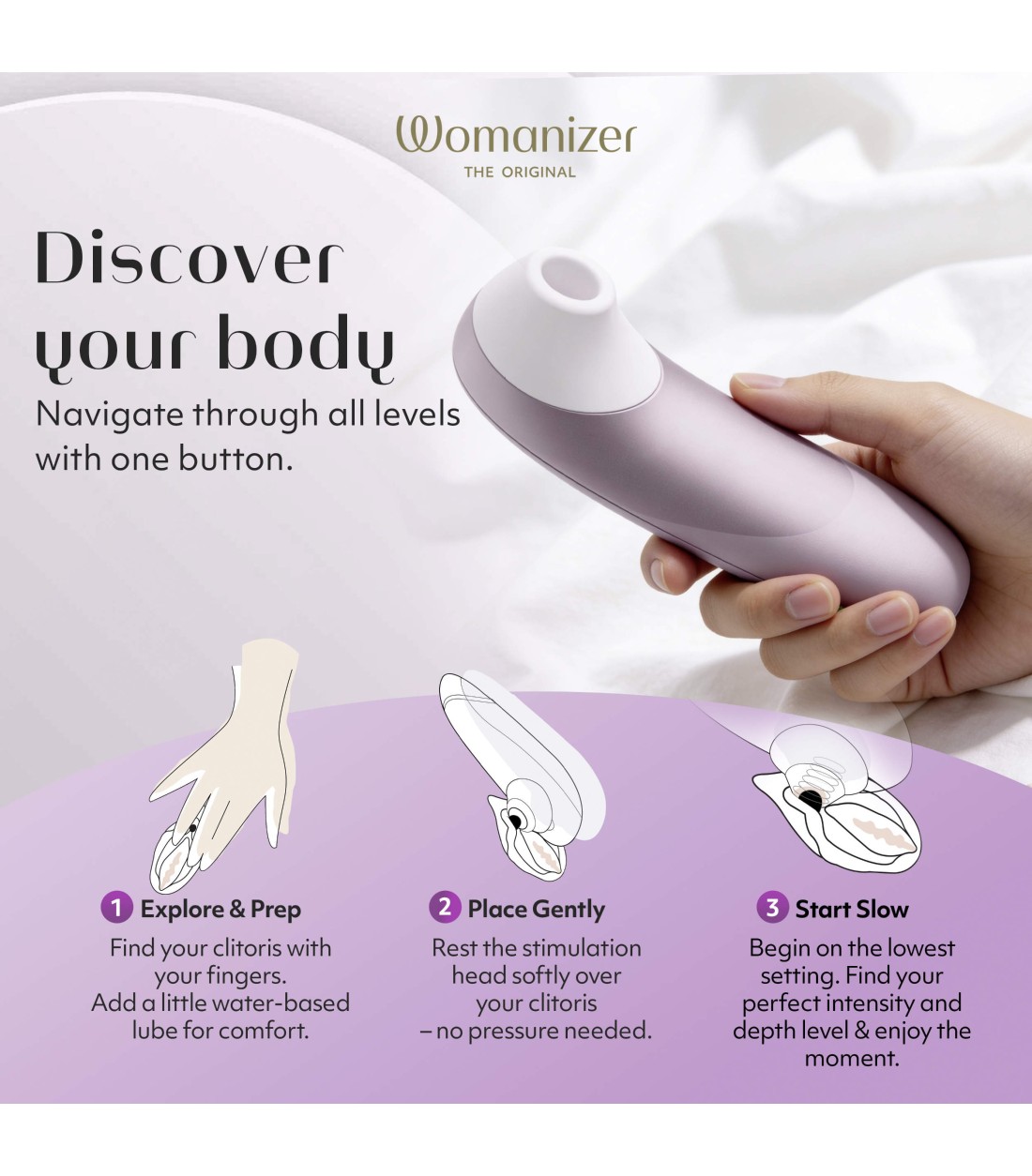 Womanizer PRO är en ny klitorisstimulator från Womanizer när det kommer till vacker, enkel design som påminner om en av deras första modeller Pro100. Det en härlig leksak för starka och sköna orgasmer. I praktiken utan någon direkt fysisk beröring av klitoris, stimuleras din klitoris på en helt nytt och spännande sätt! Den nya serien av denna Womanizer kommer i flertal härliga och fräscha färger och till ett mycket bra pris, så att alla kan testa på ljudvågor och se vad det handlar om.