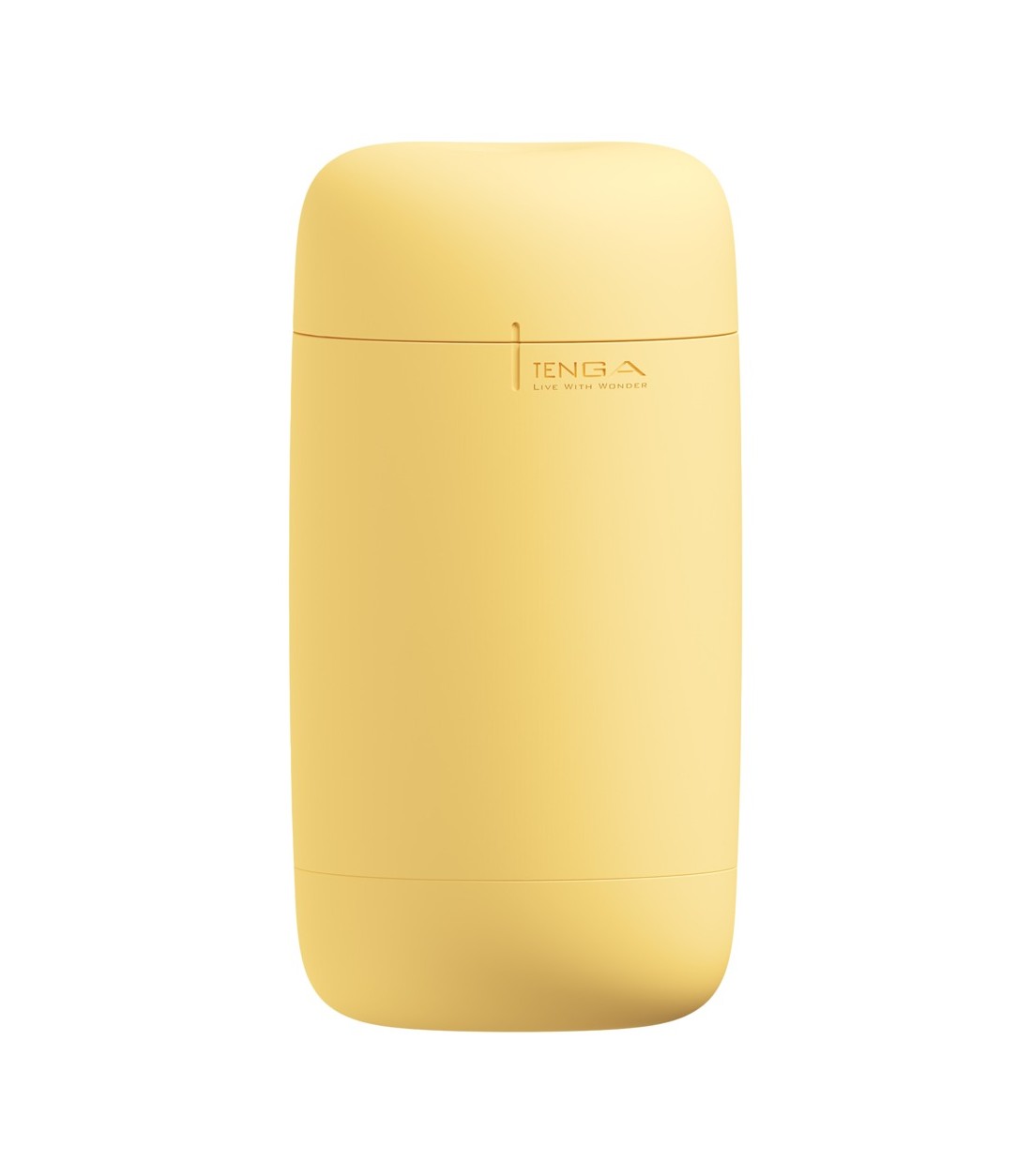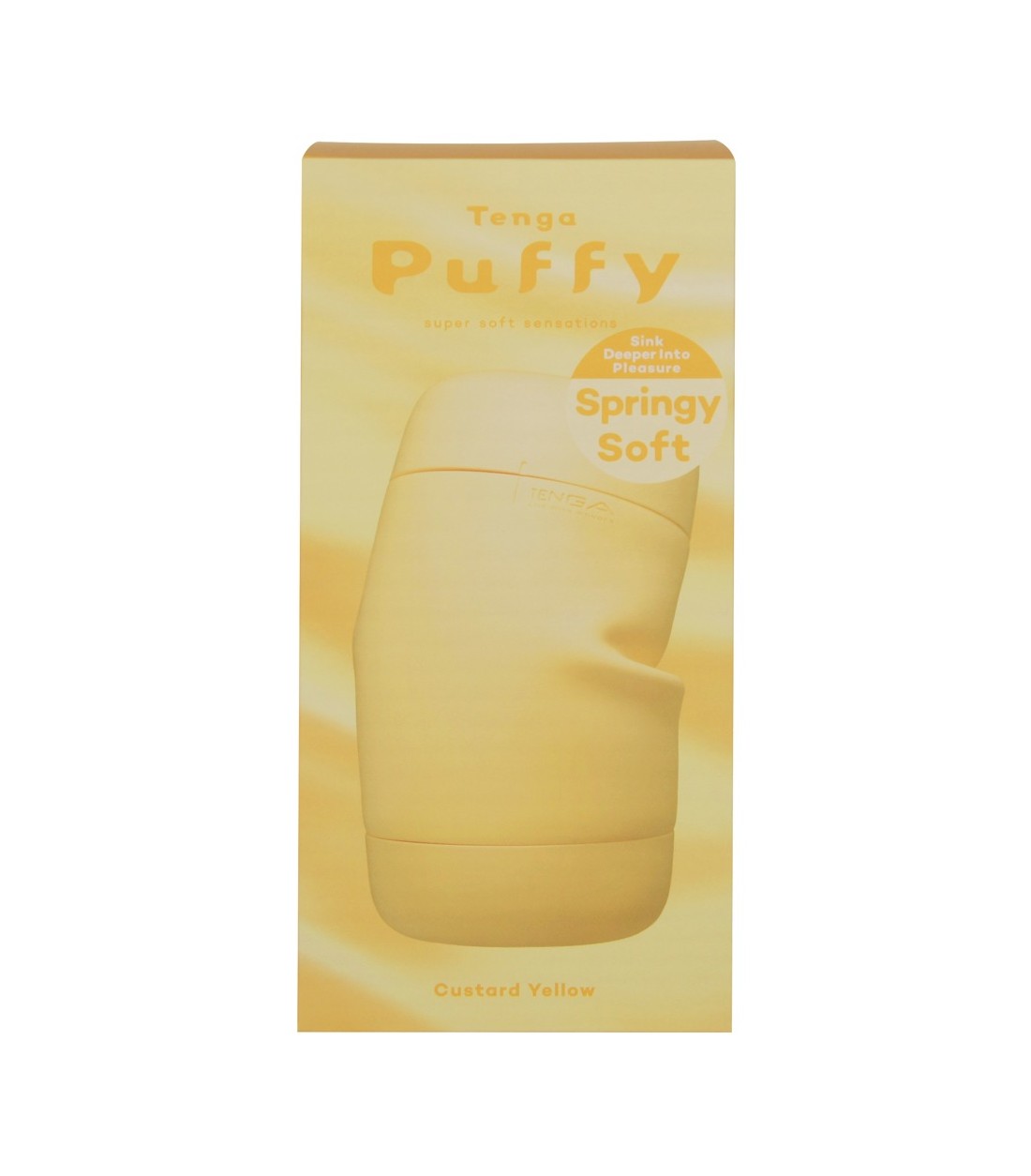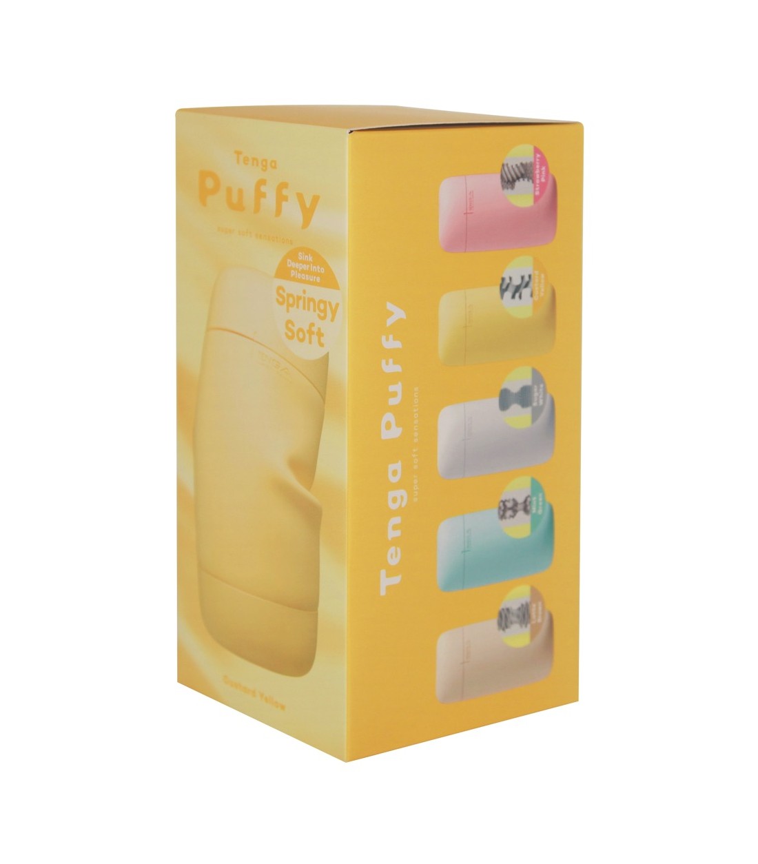 Puffy från Tenga kommer i tre olika färger, och alla färger ha olika texturer på insidan. Denna gula Custard Yellow, har många, vridna knottror som smeker sig skönt och mjukt. Den har stark stimulation med många detaljer.