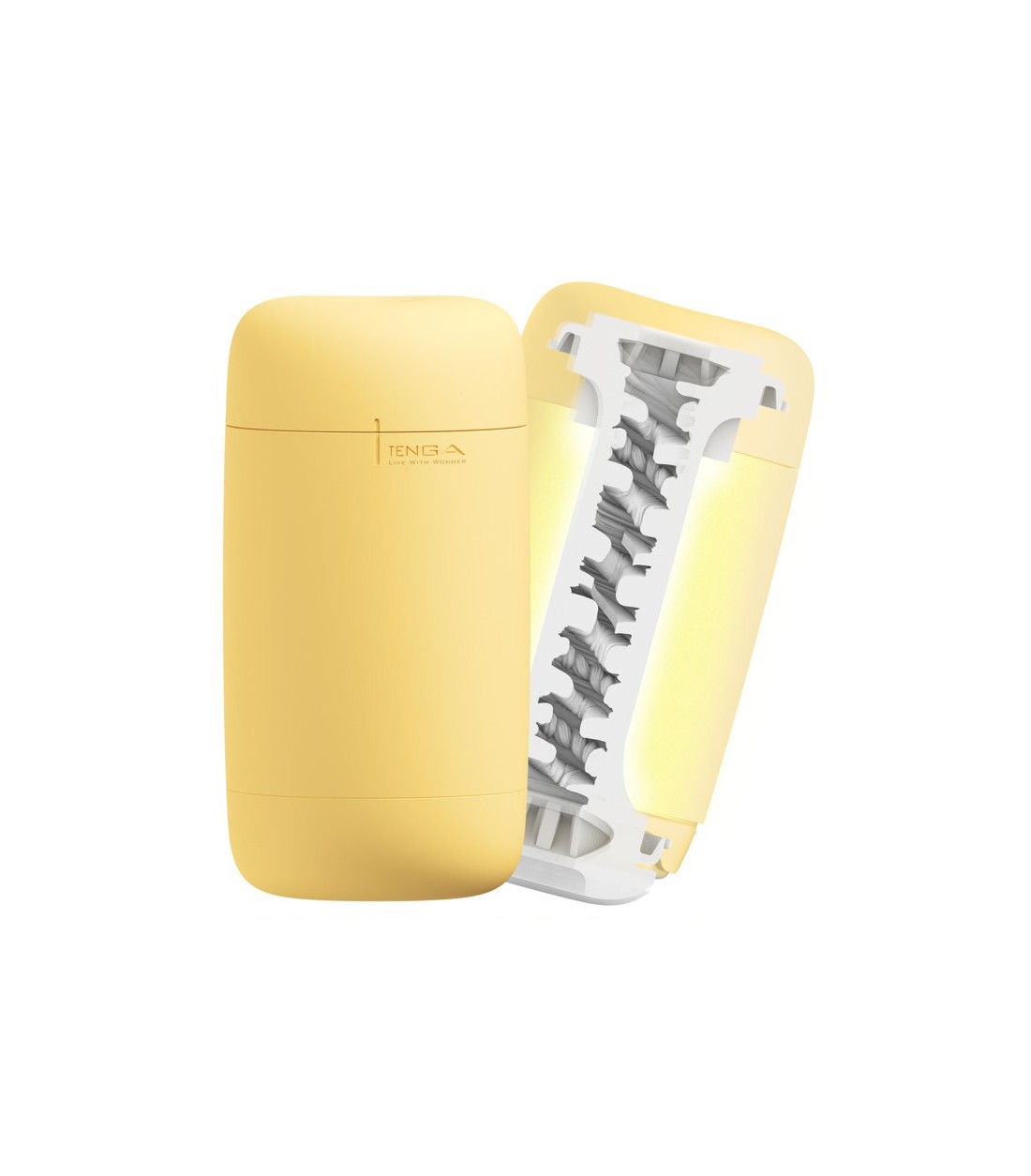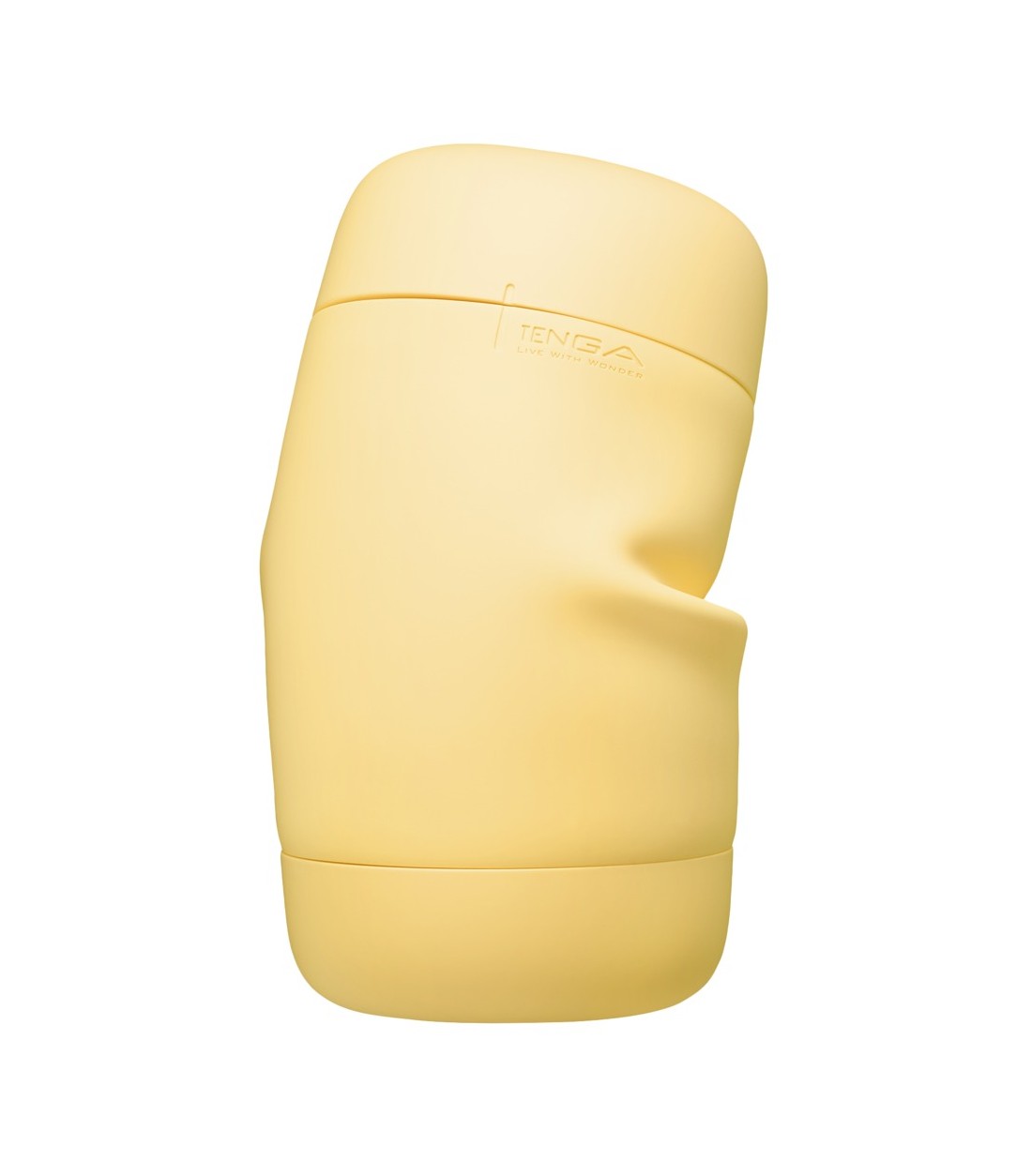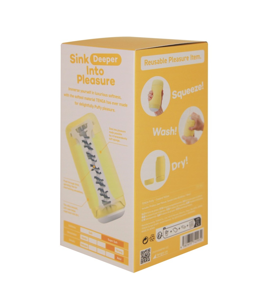Puffy från Tenga kommer i tre olika färger, och alla färger ha olika texturer på insidan. Denna gula Custard Yellow, har många, vridna knottror som smeker sig skönt och mjukt. Den har stark stimulation med många detaljer.