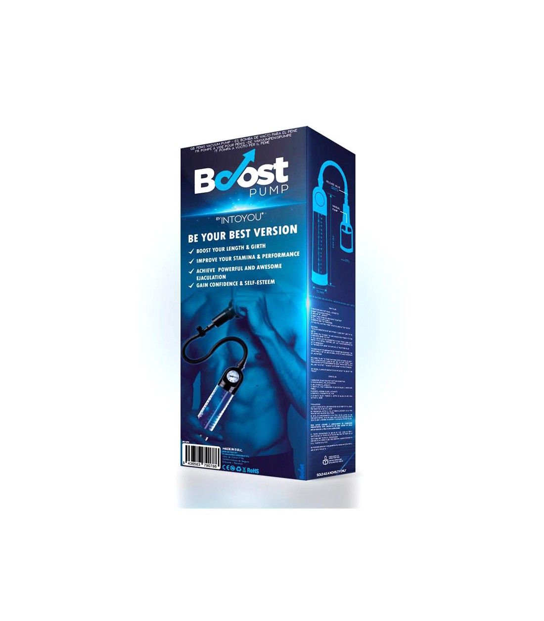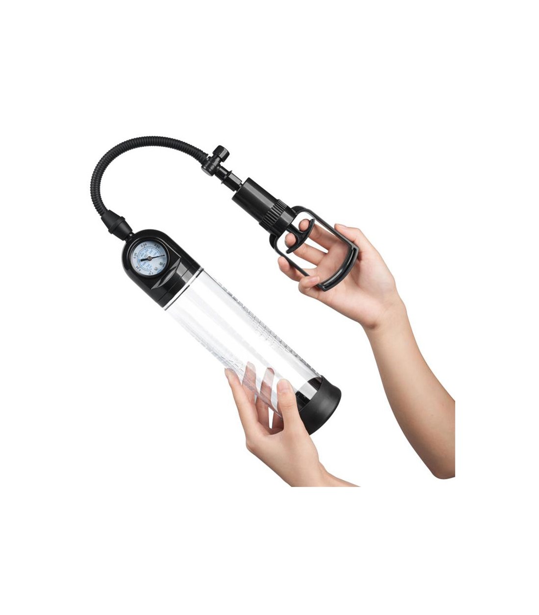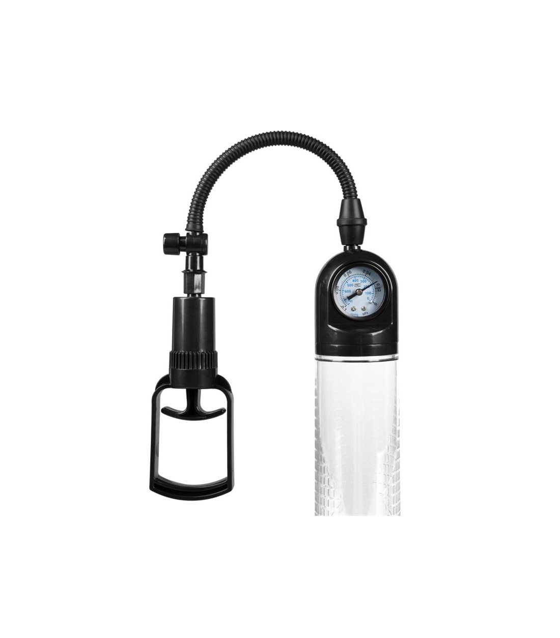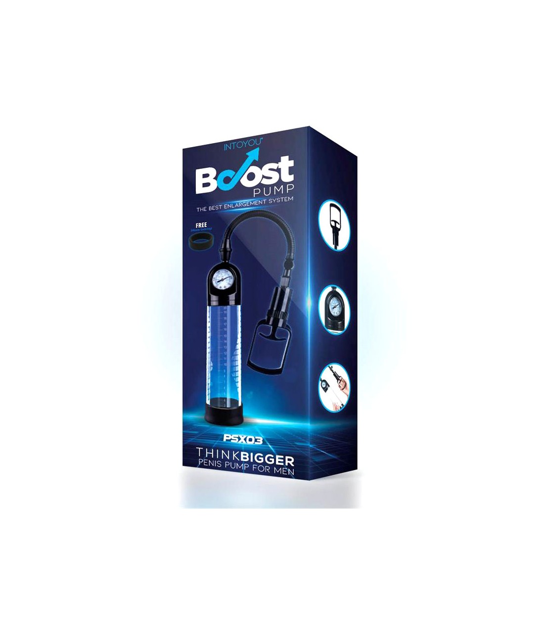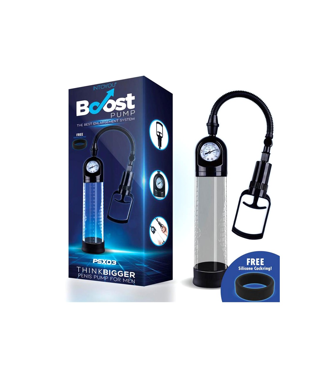Boost - Penis Pump PSX03 - ganska vanlig pump, men med finesser som tryckmätare som inte finns på många pumpar. Bekvämt pumphandtag, mjuk inner-ring för extra komfort, smart tryckmätare och stor cylinder med mätskala. Quick release-ventil har den också och man får med en enkel penisring.