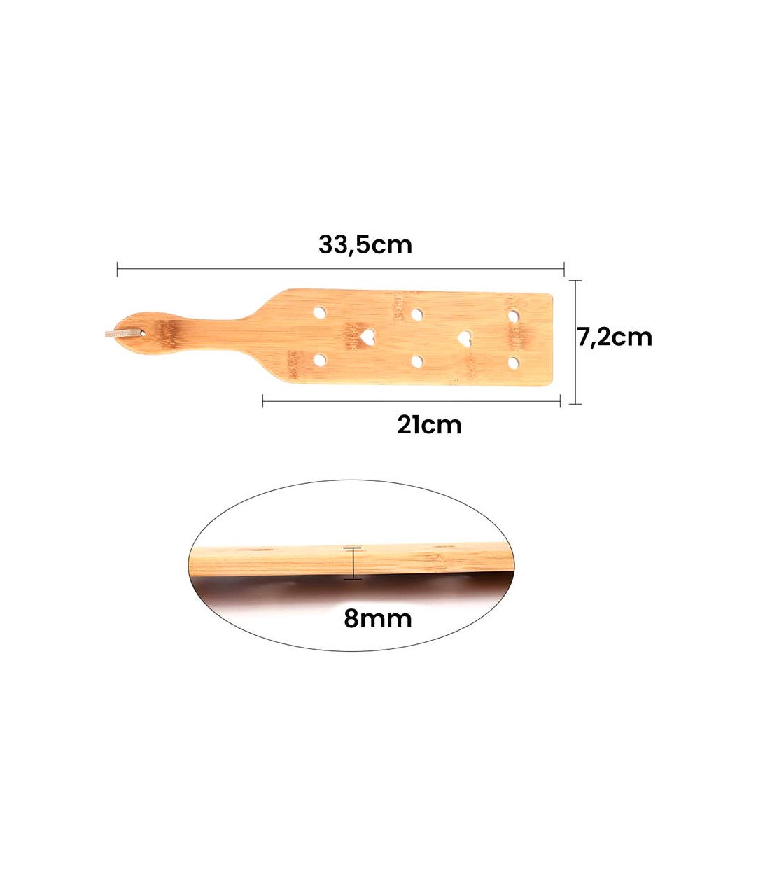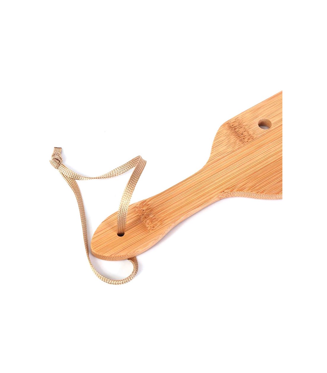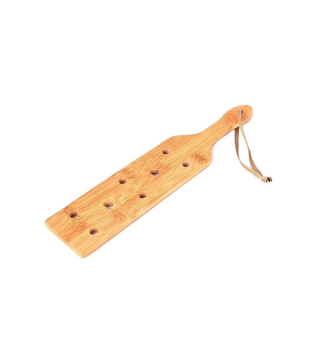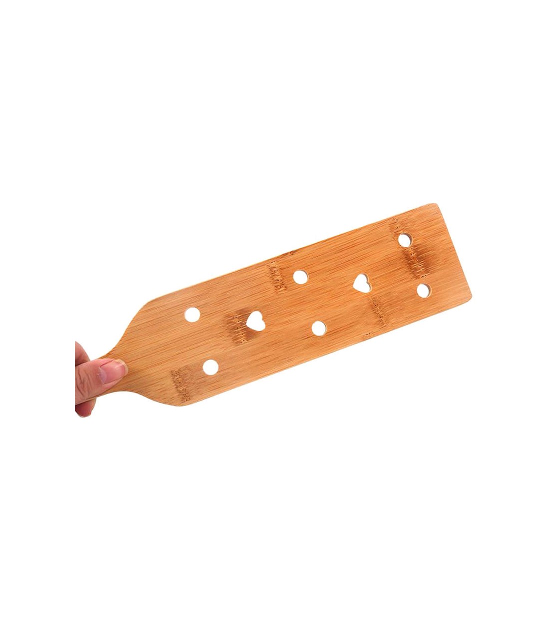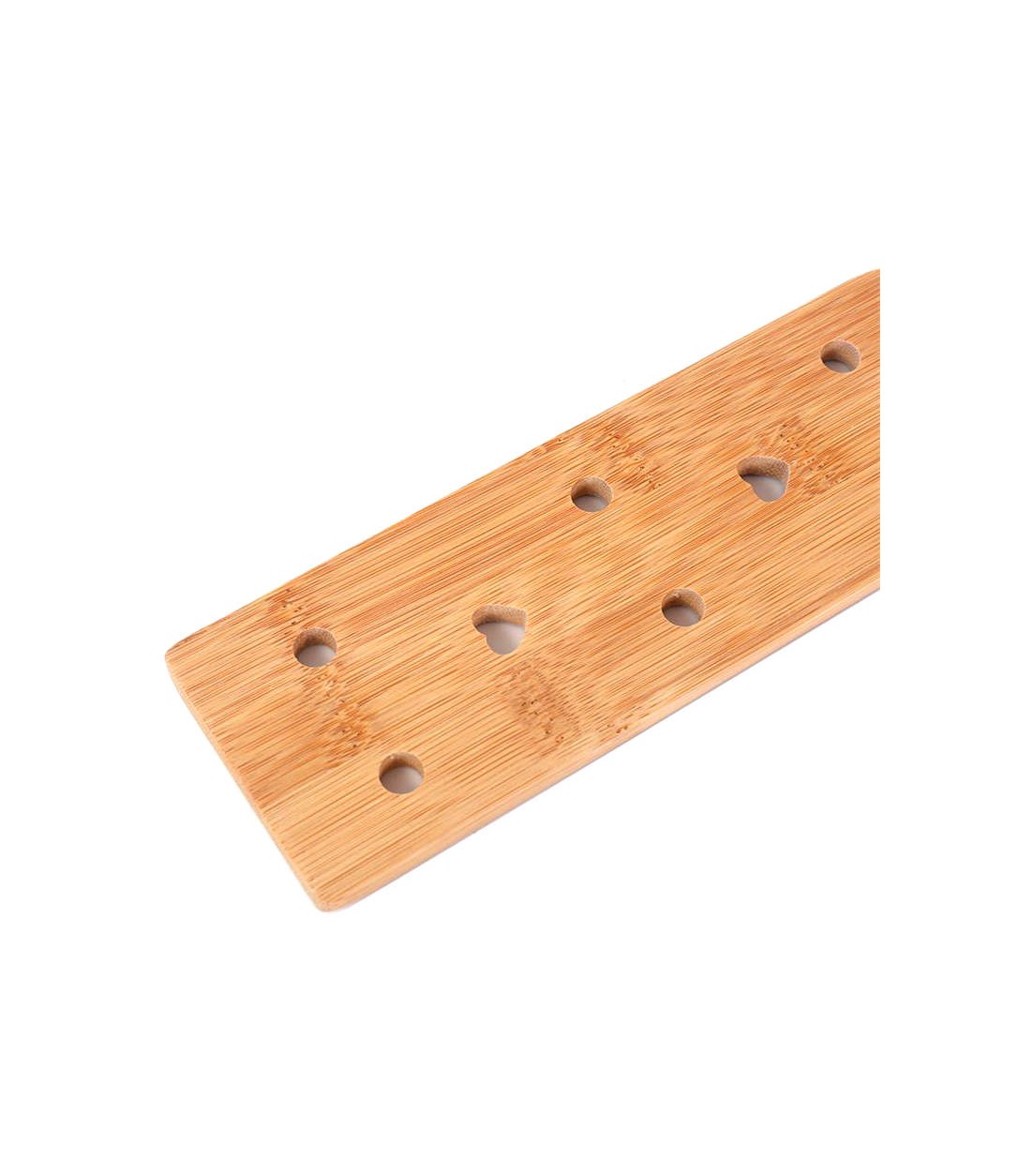 En mycket gedigen, lagom stor paddel av bambu med små hål, vissa runda och vissa hjärtformade för att det ska vara lättare att röra paddeln i luften och minska luftmotståndet. Samtidigt är bambu ett ganska lätt träslag, så paddeln är inte särskilt tung.