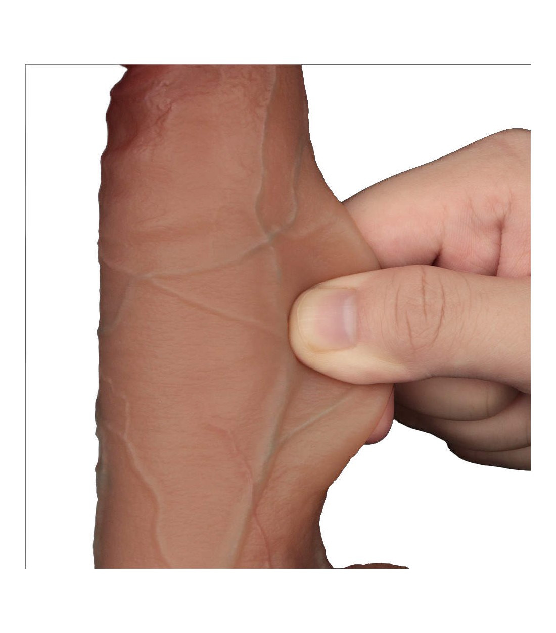Den yttre delen som är det andra lagret känns nästan som hud, riktigt skinn som sitter på dongen. Skinet rör sig inte riktigt, men uppför sig som på en penis under en erektion.