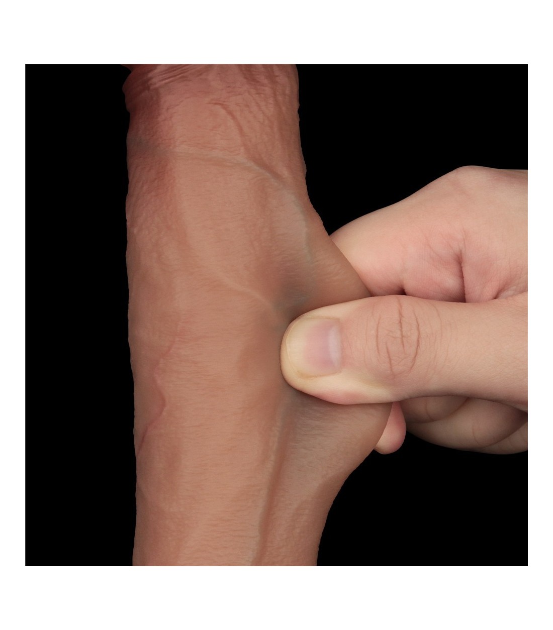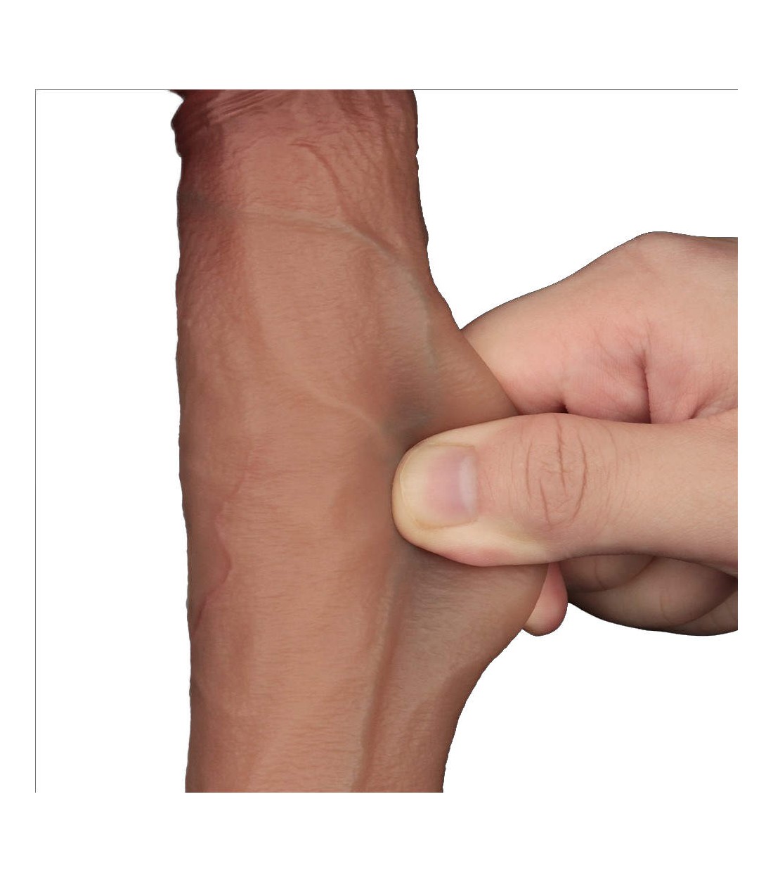 Den yttre delen som är det andra lagret känns nästan som hud, riktigt skinn som sitter på dongen. Skinet rör sig inte riktigt, men uppför sig som på en penis under en erektion.