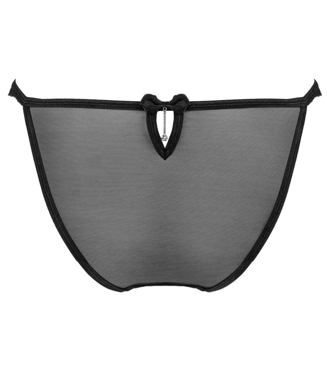 En mycket snygg, svart och minimal trosa, tillverkad av mjukt och behagligt spetsmaterial framtill samt ett fint, genomskinligt satinmaterial baktill för skön komfort. En knappt täckande trosa, med fint mönster i samt silvriga smycken på båda sidorna och även en rosett baktill - allt matchar övriga plagg i Ivannes-serien.