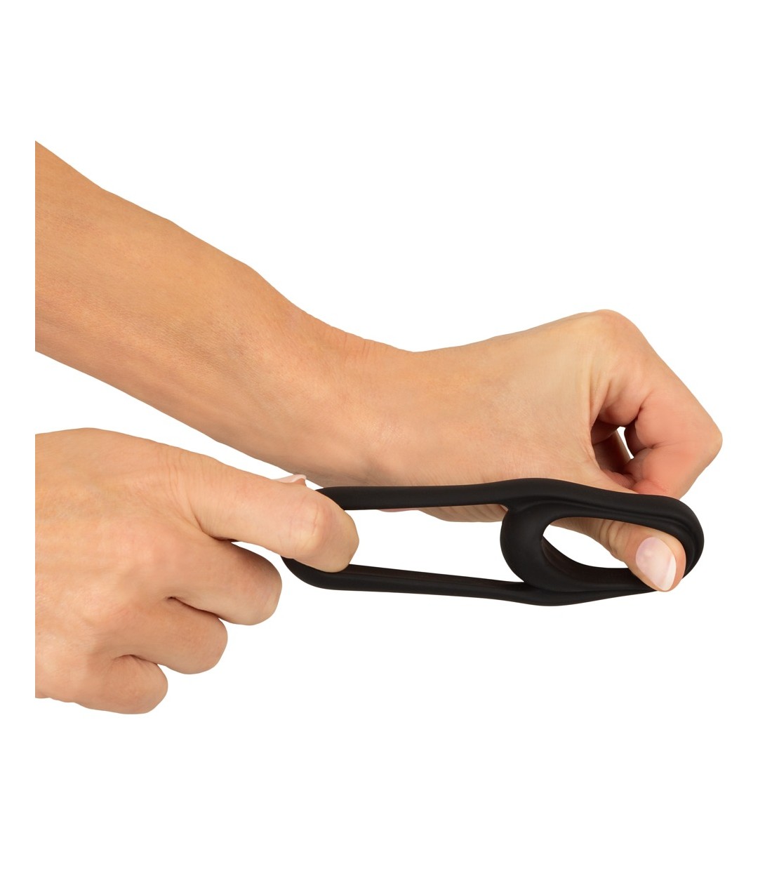 En kraftig och flexibel. blåsvart dubbelring för penisen och pungen för att klämma åt och låta dig ha sex lite längre, samt även ge lite avstång till pungsäcken!